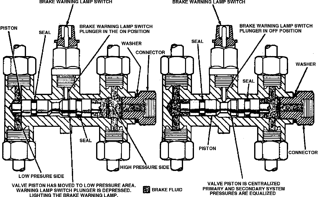 In Fig. 5, the valve assembly consists of two valves in a common bore that are spring loaded toward the centered position. The spring-loaded switch contact plunger rests on top of the valves in the centered position (right view). When a pressure differential occurs between the front and rear brake systems, the valves will shuttle toward the side with the low pressure. The spring-loaded switch plunger is ``triggered'' and the ground circuit for the warning lamp is completed, lighting the lamp (left view).