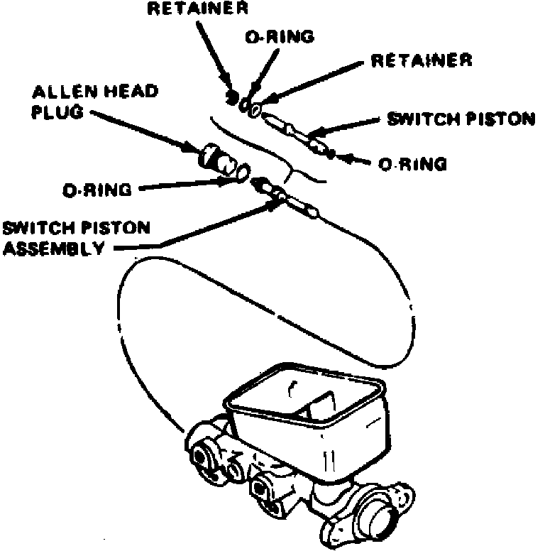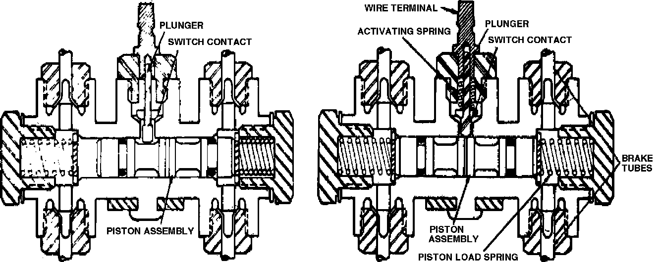 In Fig. 6, as pressure falls in one system, the other system's normal pressure forces the piston to the inoperative side, contacting the switch terminal, causing the warning lamp on the instrument panel to glow.