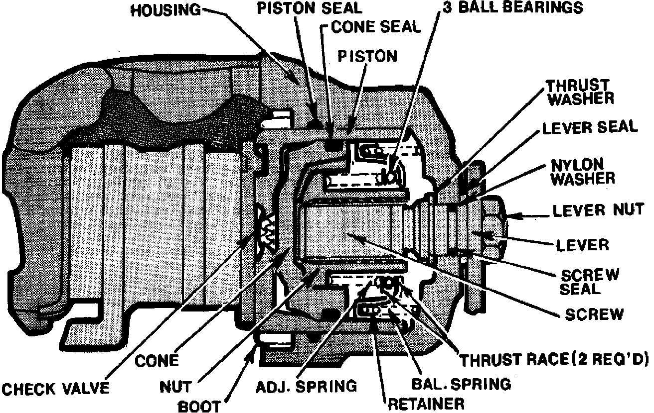 Upon application of brake, Figs. 1 & 2, the cone and piston move out as one part. The nut remains stationary on the high lead screw and a gap develops between the cone and nut. When lining wear occurs, the cone and piston do not return to their original position, thereby leaving a small gap equal to the lining wear between the nut and cone. The adjusting spring causes the nut to rotate on the high lead screw to close the gap and adjust the caliper.