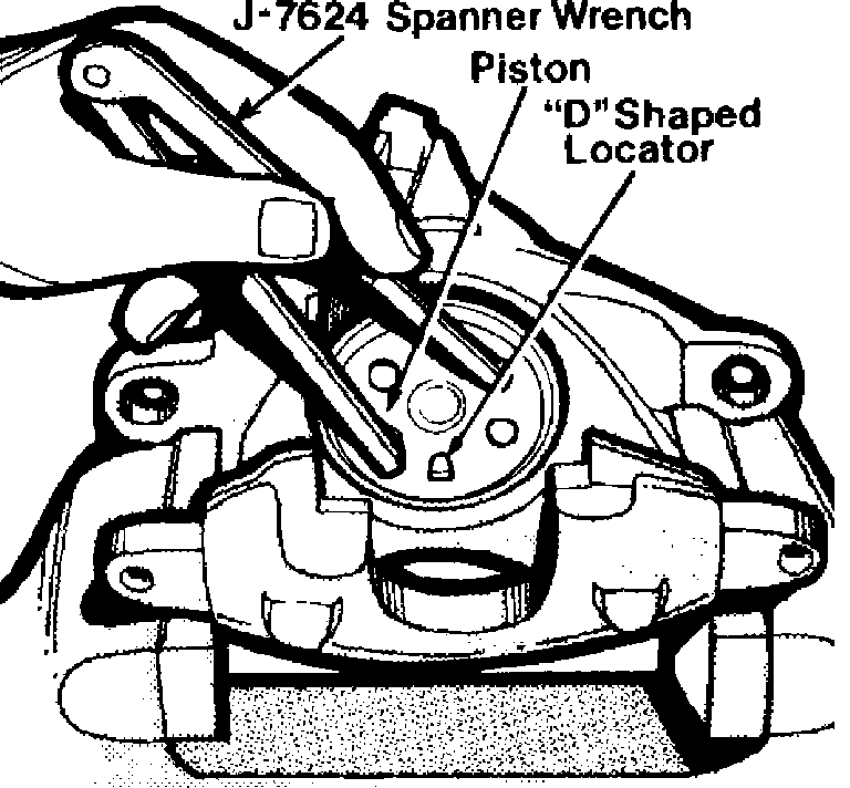 4. Position new inboard shoe assembly on piston. The D-shaped tab must fit into indentation in piston. If piston requires rotation, use tool J-7642 to rotate it, Fig. 8. Install new spring retainers on all except Eldorado outboard shoe assembly.
