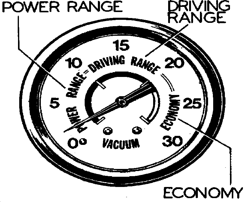 Since the optimum fuel economy is directly proportional to a properly functioning engine, a high vacuum reading on the gauge relates to fuel economy. For this reason some manufacturers call the vacuum gauge a ``Fuel Economy Indicator.'' Most gauges have colored sectors the green sector being the ``Economy'' range and red the ``Power'' range. Therefore, the vehicle should be operated with gauge registering in the green sector or a high numerical number, Fig. 3, for maximum economy.