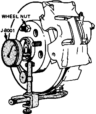To check wheel bearing assembly for looseness, free brake pads from disc or remove calipers. Install two lug nuts to secure disc to bearing. Mount dial indicator as shown in Fig. 9, then rock disc and note indicator reading. If looseness exceeds .005 in. replace hub and bearing assembly.