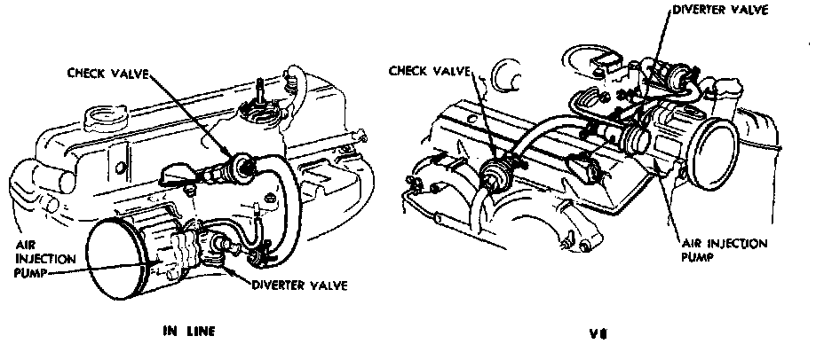 The air injection system, Figures 2 and 3, supplies the oxygen needed to ignite and burn any unused fuel in the exhaust system by injecting fresh air into the exhaust system--near the exhaust valves--via the air manifolds, hoses and injection tubes