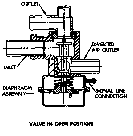 The diverter--or air by-pass valve, Figs. 4 and 5--prevents backfiring--when triggered by a sharp increase in manifold vacuum--by shutting off the injected air to the exhaust port areas during this richer period.