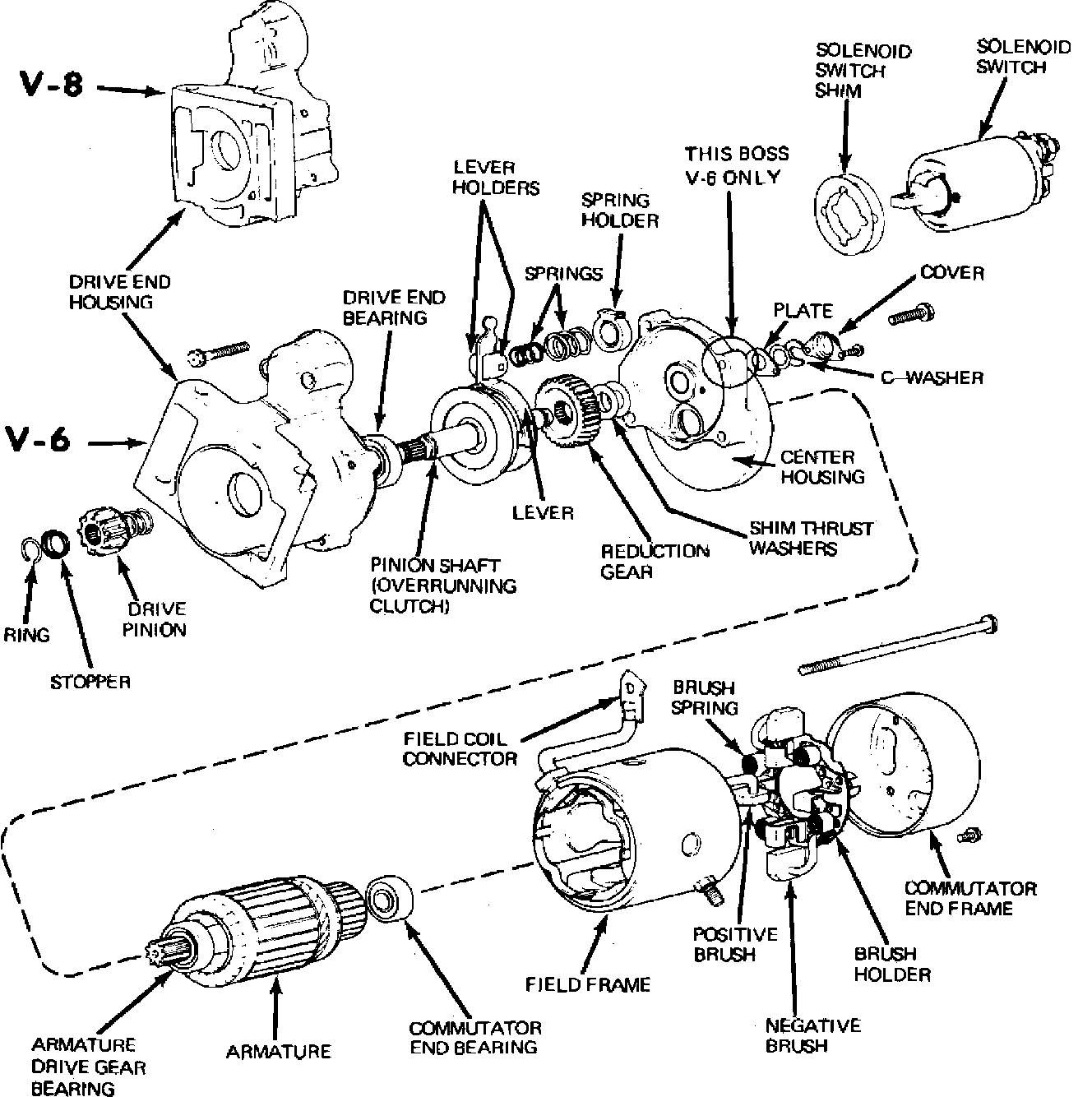 The Mitsubishi starter, Fig. 1,is a gear reduction starter that has the solenoid shift lever mechanism enclosed in the drive end housing to protect them from exposure to road dirt, icing conditions and splash. They also have an an overrunning clutch type drive. The overrunning clutch is operated by a solenoid switch mounted to a flange on the drive end housing.