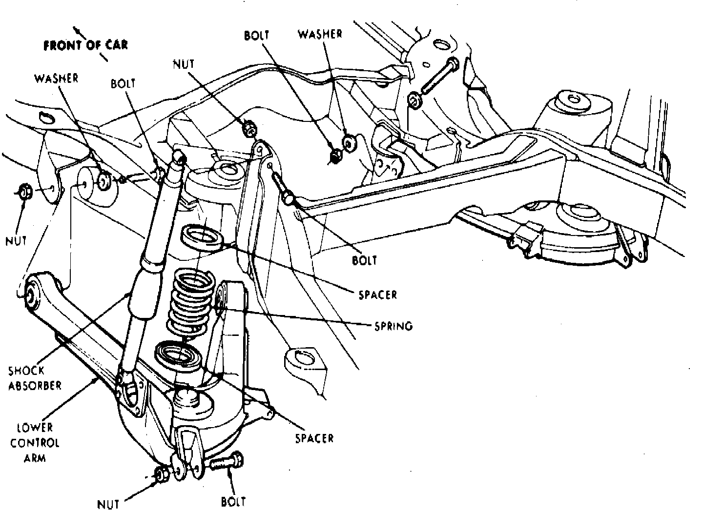 7. Reverse procedure to install. Locate bottom end of spring between dimples on lower control arm assembly.