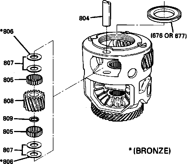 5. Inspect washers, needle bearings and pinion shaft for wear. Discard bronze washer (806) and replace with new steel washer (807) from service kit.