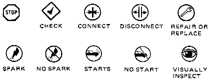 This section presents a systematic method of diagnosing and troubleshooting the High Energy Ignition system. The charts you will be using are different from the ones you have used before. They aren't "go - no go" decision trees or tables. Instead the new diagnosis and troubleshooting charts use pictures plus a few words to help you solve a problem, and symbols have replaced words.