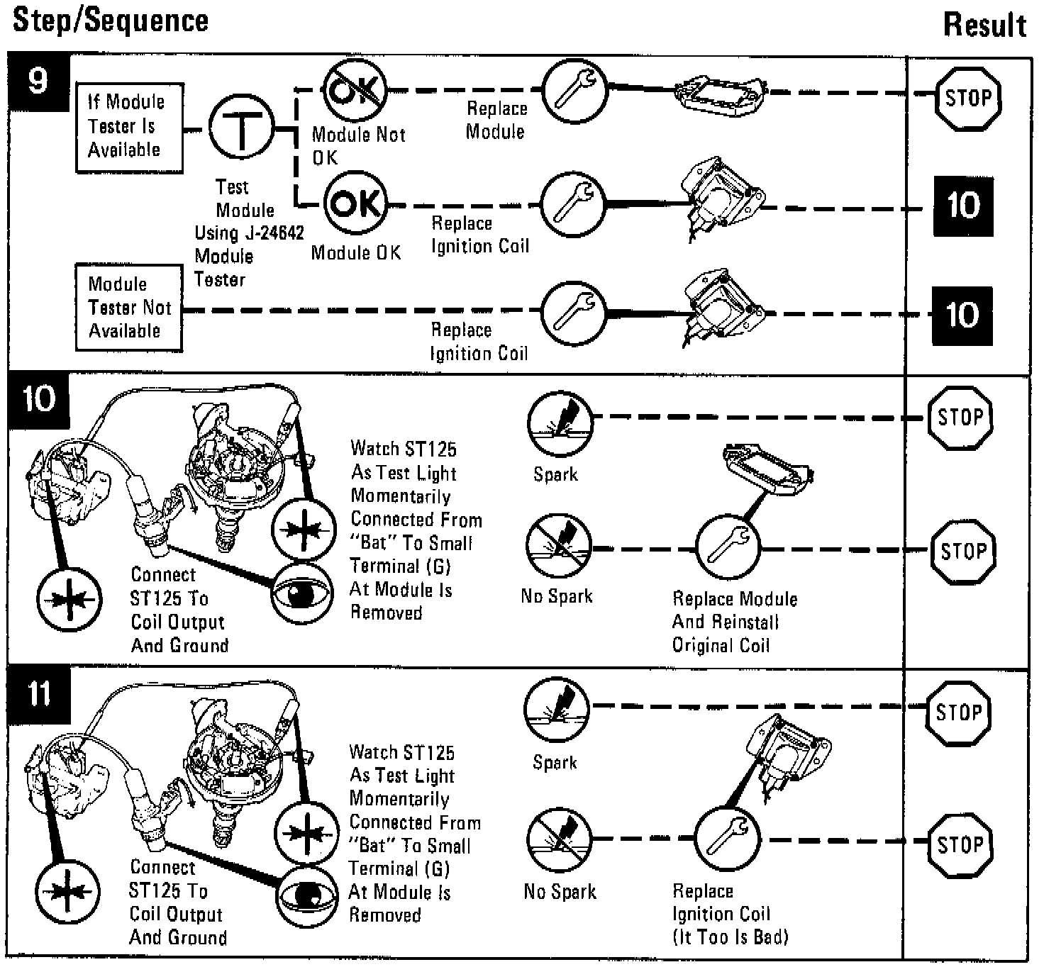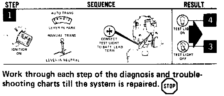 A sequence could be checking the battery lead terminal on the distributor. Each sequence ends with a result and tells you the next step to go to. Work through each step of the diagnosis and trouble-shooting charts until the system is repaired.
