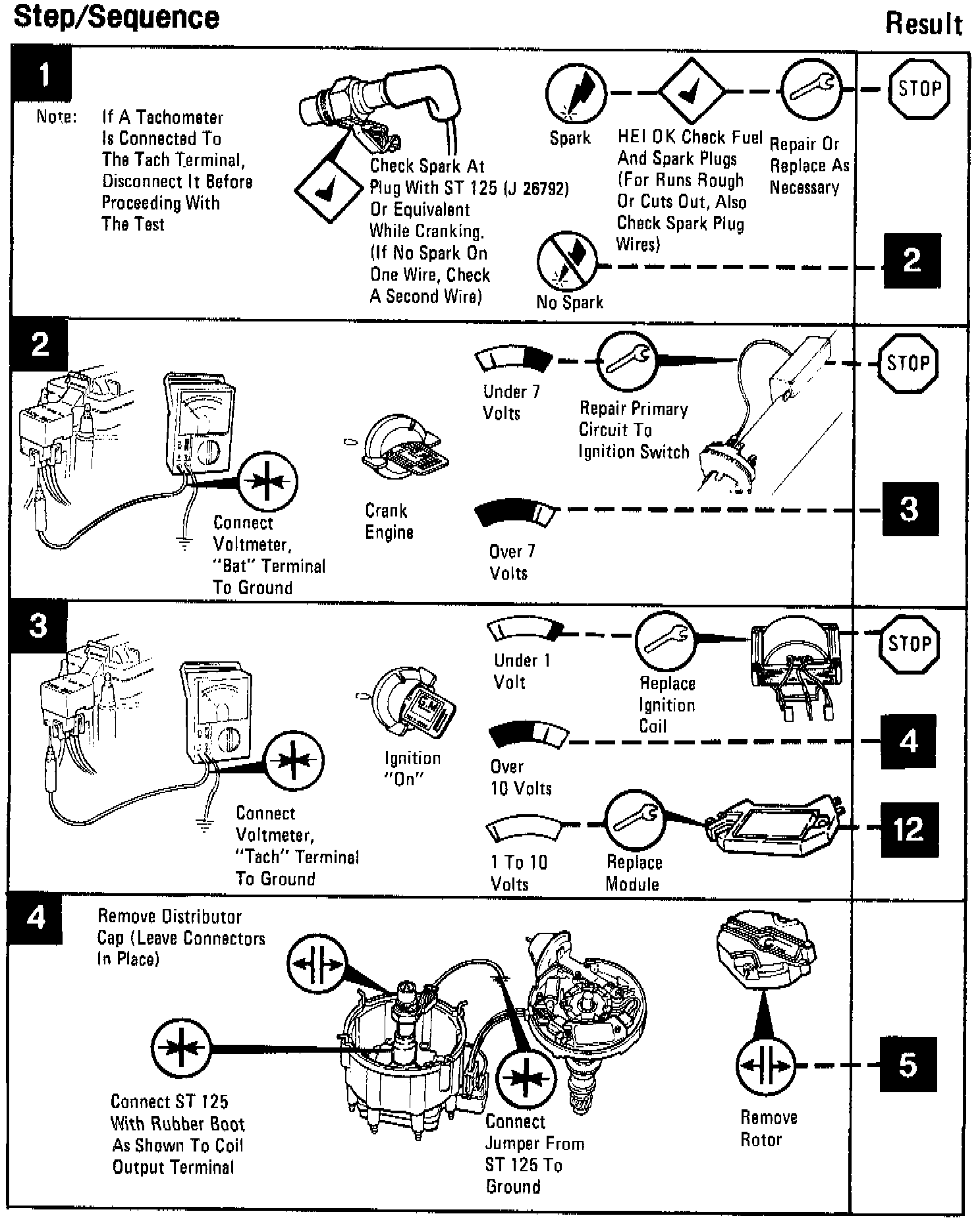 For diagnosis of the HEI System, follow the charts with the appropriate heading for the problem being experienced. These charts cover problems in the ignition system only. Do not overlook other systems such as fuel and carburetion, valves, engine compression, etc., that might cause the same complaint.