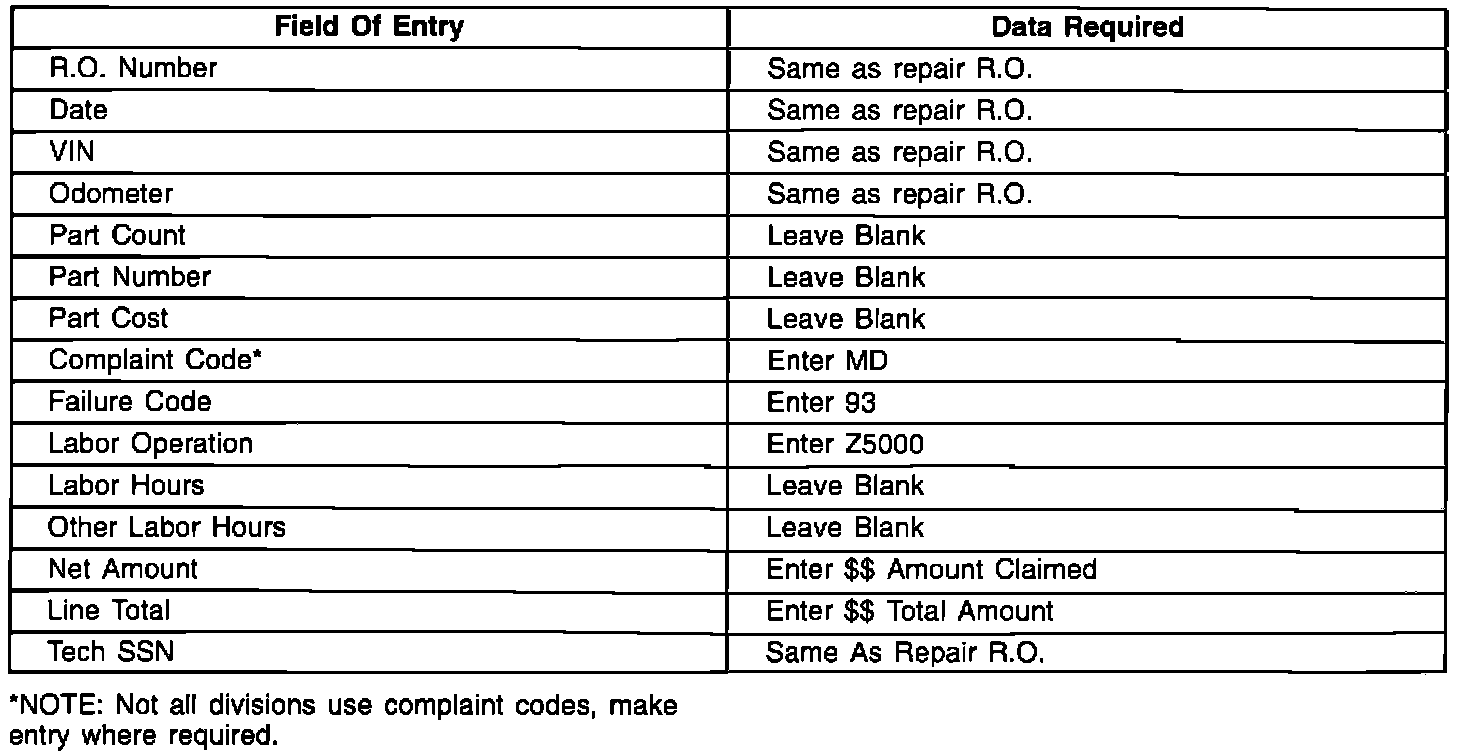 If the evaporator core in the previous example had been obtained from GMSPO through a VIP overnight parts order, the following example shows correct warranty claim submission for the additional cost. The published GMSPO dealer price for the core is $199.80. The GMSPO charges associated with the VIP overnight order would be $11.99 ($2.00 per line plus 5% of the dealer price). The repairing division would reimburse this amount, plus any applicable freight charges, submitted under labor operation Z5001 as a net amount, (VIP charges of $11.99 + $18.00 express shipping charges = $29.99).