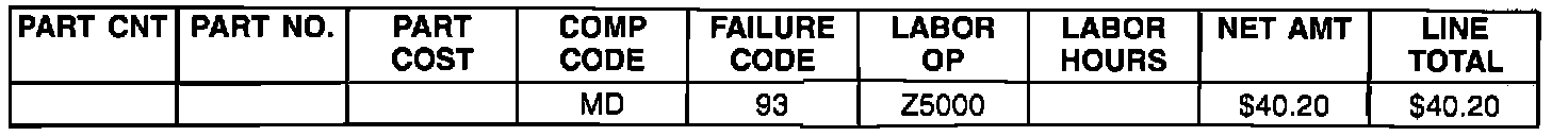 The following example utilizes an evaporator core as the required part. In the example, the dealer/retailer purchased the part from another dealer/retailer for $240.00. The repairing division will compensate the dealer/retailer for the dealer net plus the normal parts allowance (30% for 93 and prior, 40% for 94 and future) $199.80 + 59.94 = $259.74 as part of the regular labor operation D3320. The additional part cost over and above dealer price, ($240.00 - 199.80 = $40.20) should be submitted under labor operation Z5000 as a net amount.