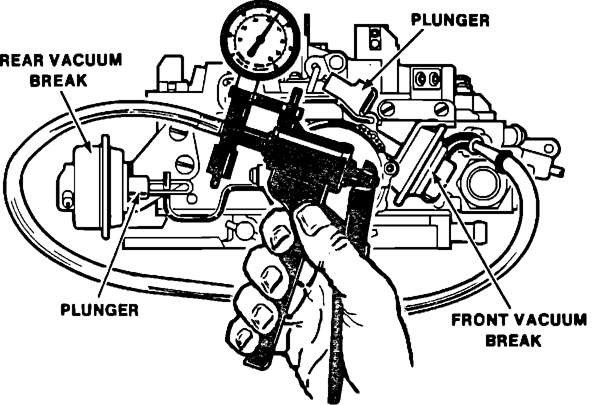 A. The vacuum break plunger should move full travel. Apply finger pressure to plunger to see that it has moved through full travel. If not, replace the vacuum break and adjust to specification. The labor operation time for replacing the vacuum break unit includes adjustment.