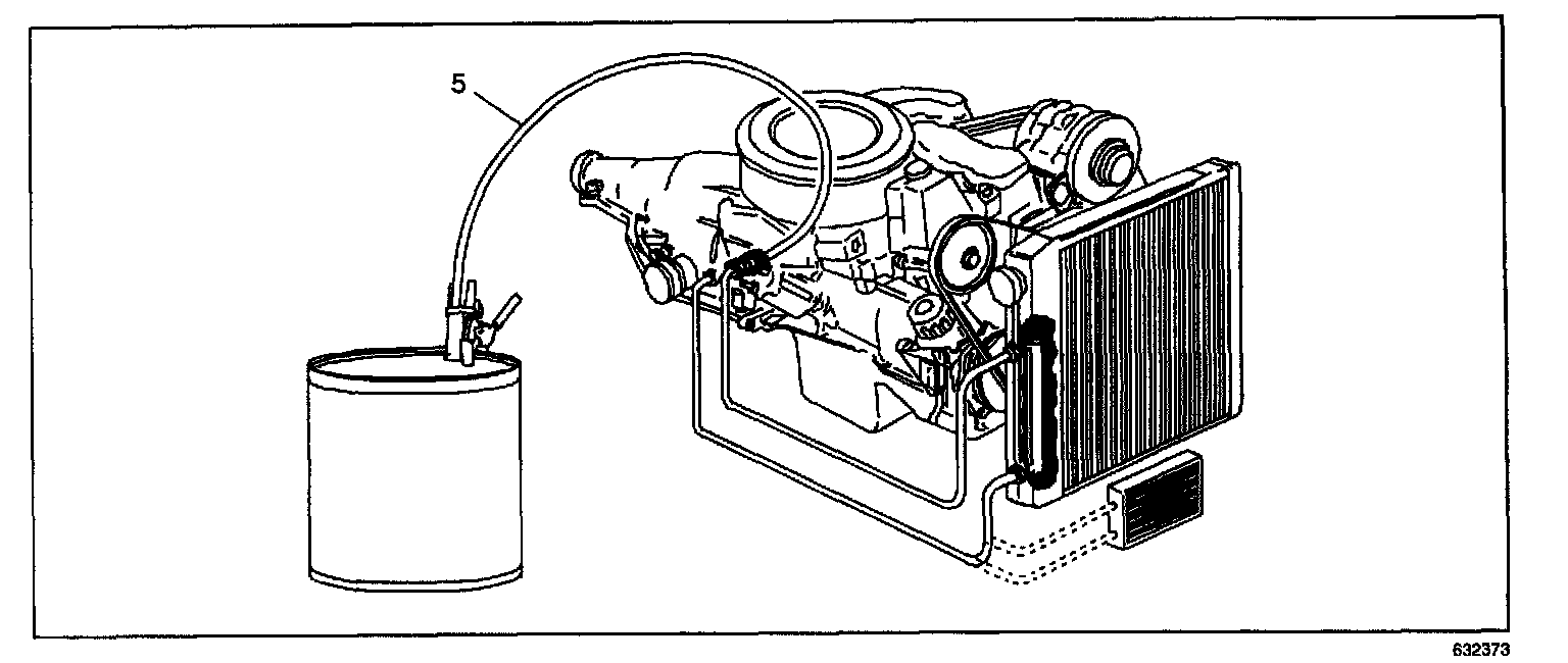 4. Remove the discharge hose (5), reconnect the cooler feed and return pipes to the transmission and refill the unit to the proper fluid level. Inspect the transmission oil cooler pipe connections at the radiator, the auxiliary cooler (if equipped) and the transmission for leaks. Refer to Section 7 of the appropriate Service Manual.