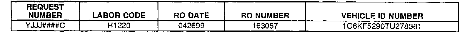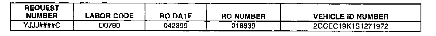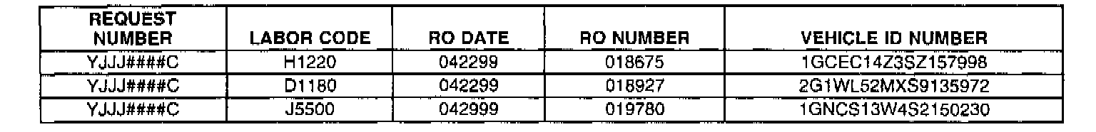 LISTED BELOW ARE PART REQUESTS THAT HAVE NOT BEEN RECEIVED AT THE WARRANTY PARTS CENTER AS OF THIS DATE. IF YOUR RECORDS INDICATE THAT YOU HAVE RETURNED THE REQUESTED PART (ALLOW 7 DAYS FOR SHIPPING AND HANDLING), IT IS IMPERATIVE THAT YOU FOLLOW-UP WITH THE WPC AT 248/371-9901/9902 (OR FAX AT 248/371-9005) TO RESOLVE THE ISSUE AND AVOID POSSIBLE DEBIT.