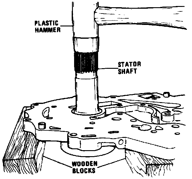 8. Install case cover gasket and case cover assembly, then install retaining bolts and torque to specifications. If input shaft cannot be rotated as case cover is being bolted into place, the forward or direct clutch housing has not been installed properly to index with all the clutch plates. Correct this condition before case cover is pulled fully into place.