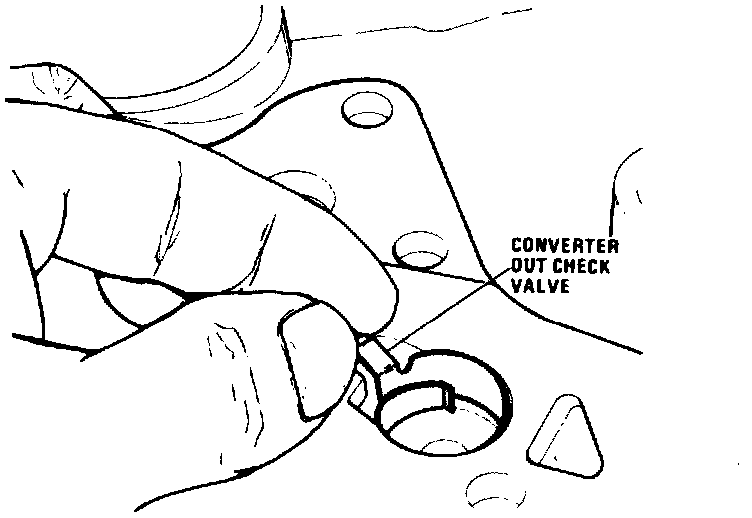 1. Install converter out check valve, with tanged end first into oil passages and coil remainder of valve with itself, see image.