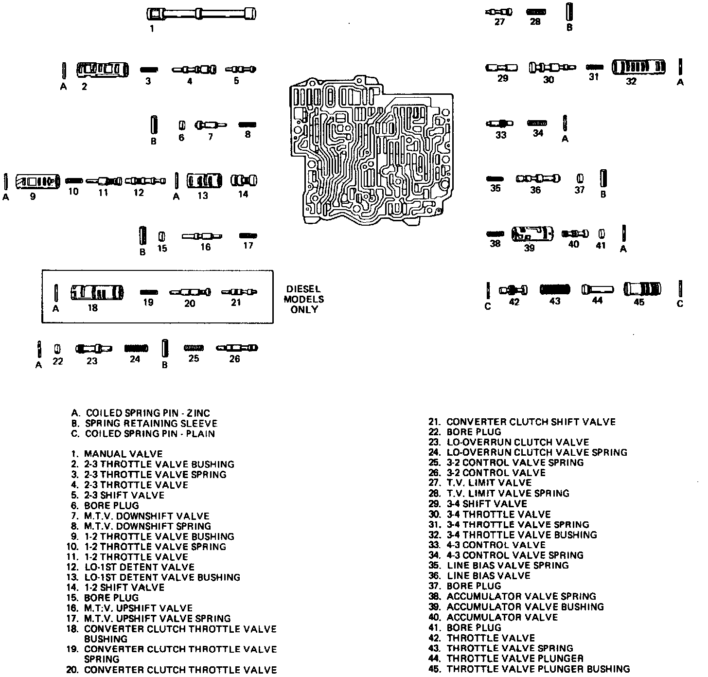 12. In next bore up, install the T.V. modulator downshift valve spring and valve, smaller chamfered stem end first Install the bore plug, then the spring-retaining sleeve.