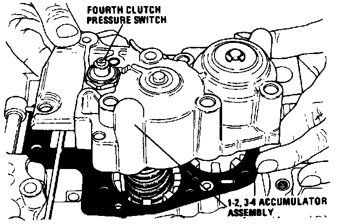 1. Remove the 1-2, 3-4 accumulator housing retaining bolts, then the housing and 1-2 spring, see image.