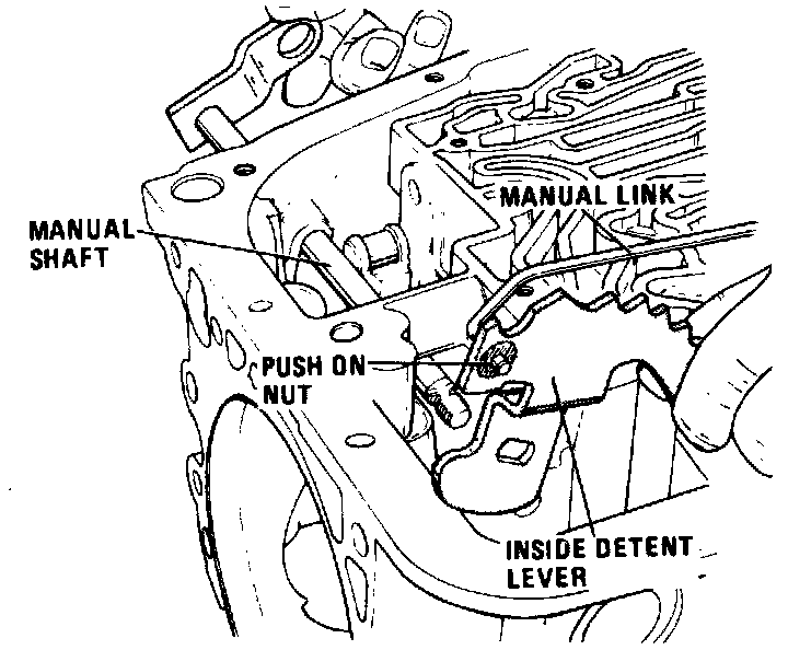 g. Remove hex nut, then remove manual shaft and inside detent lever assembly, see image.