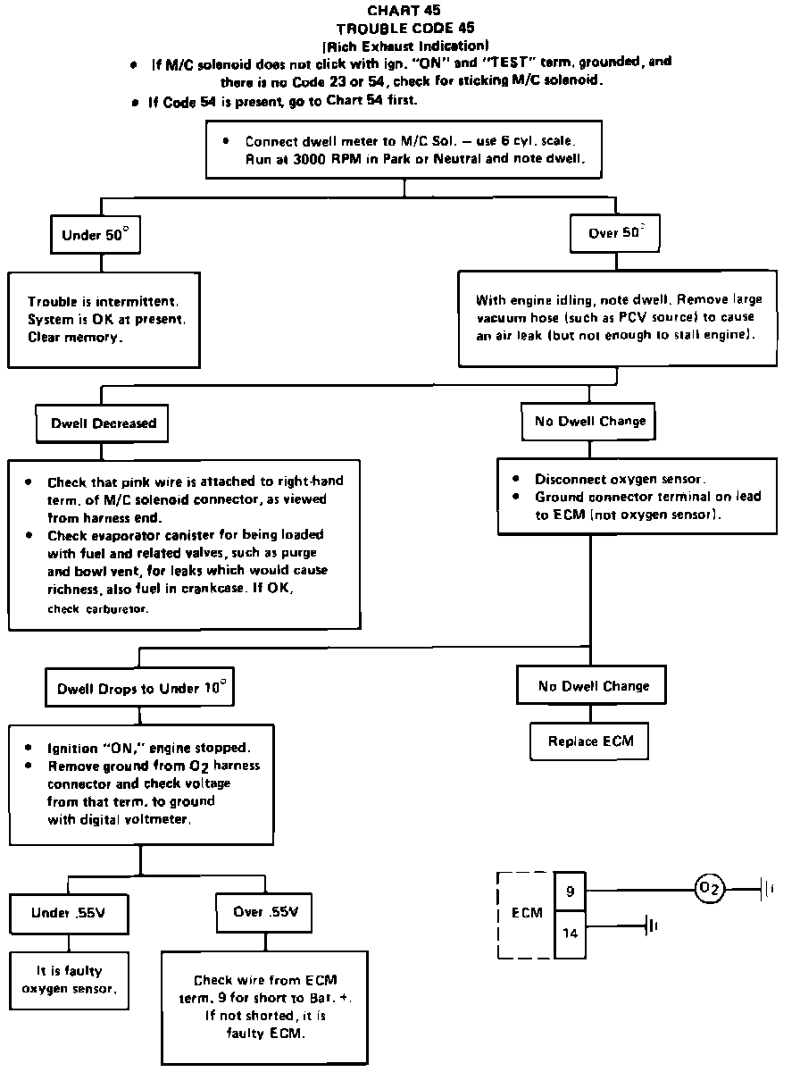 3. This step tests to see if ECM is able to respond to a lean exhaust O2 signal (low voltage). If no dwell change with a grounded lead to O2 sensor Term. "9", fault is in ECM. It couldn't be an open O2 wire because that would set Code 13.