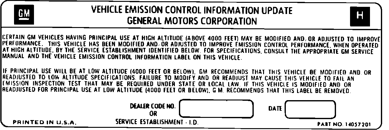 13. Type or print with ball point pen the dealer code and date in the space provided on the supplemental emission control label, part number 14057201 or equivalent, Figure 3 (part of kit). The label must be placed next to the existing underhood emission control information label to the extent possible. The label should not be affixed to any equipment that can be easily detached from the vehicle. Wash off the area with soap and water, dry thoroughly, and apply the new label.