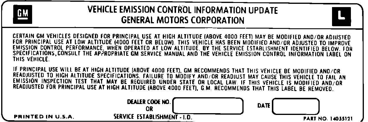 4. Type or print with ball point pen the dealer code and date in the space provided on the supplemental emission control label, part number 14055121 or equivalent (Figure 4). The label must be placed next to the existing underhood emission control information label to the extent possible. The label should not be affixed to any equipment that can be easily detached from the vehicle. Wash off the area with soap and water, dry thoroughly and apply the new label.