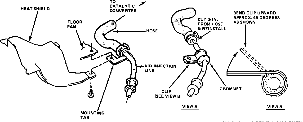 3. Modify the new clip, part no. 25515259, as shown in fig. 1, view B. Install one (1) grommet, part no. 10016079, and the new clip over the air line (refer to fig. 1, view A) and position as close to the air hose as possible. Reinstall screw, securing the clip to the floor pan and heat shield. (It may be necessary to bend the tab on the floor pan and heat shield to gain sufficient clearance.)