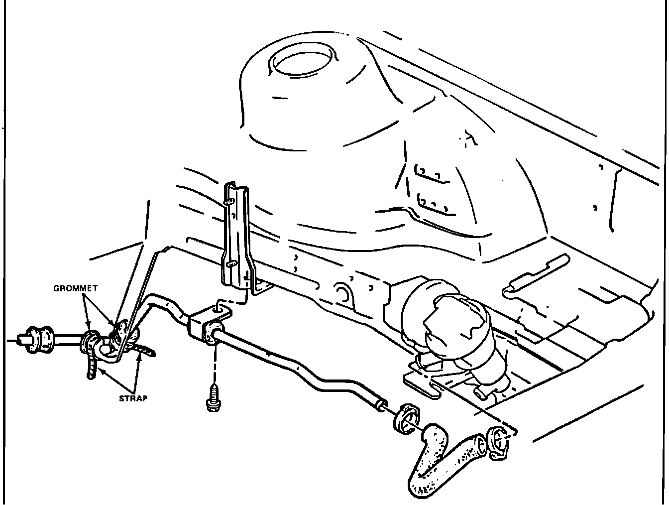 1. Hoist the car and remove screw attaching the catalytic converter air injection line to the floor pan and heat shield. Cut off mounting tab from the air injection line. (See fig. 1.)