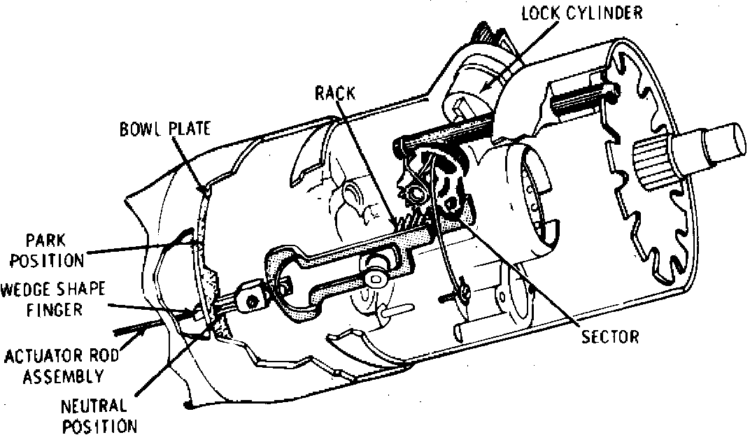 These vehicles do not use a neutral safety switch. A mechanical block on the transmission gear selector, Fig. 7, prevents starting the engine when the transmission is in any gear other than Park or Neutral.