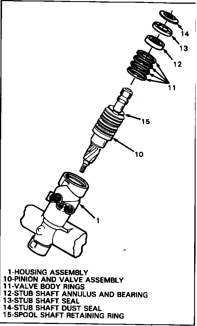10. Remove stub shaft dust seal, stub shaft seal, stub shaft bearing annulus assembly, pinion and valve assembly, with spool shaft retaining ring, and valve body rings attached.