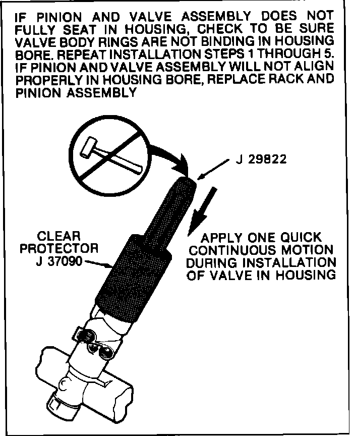 Set pinion and valve assembly onto housing using J 37090. Use J 29822 pinion seal installer to push assembly into housing bore. DO NOT hammer or use excessive force. If pinion and valve assembly does not fully seat in housing, check to be sure valve body rings are not binding in housing bore. Check rings for cuts or damage. Repeat installation steps 1 through 5. If pinion and valve assembly will not align properly in housing bore, replace rack and pinion assembly.