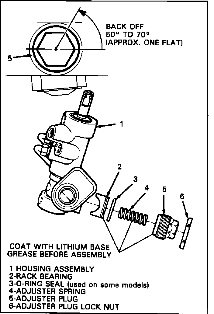 With rack centered in the housing, turn adjuster plug clockwise until it bottoms in the housing, then back off 50~ to 70~ (approx. one flat). Check torque on pinion. Maximum pinion preload torque is 1.8 N-m (16 in.lbs.).