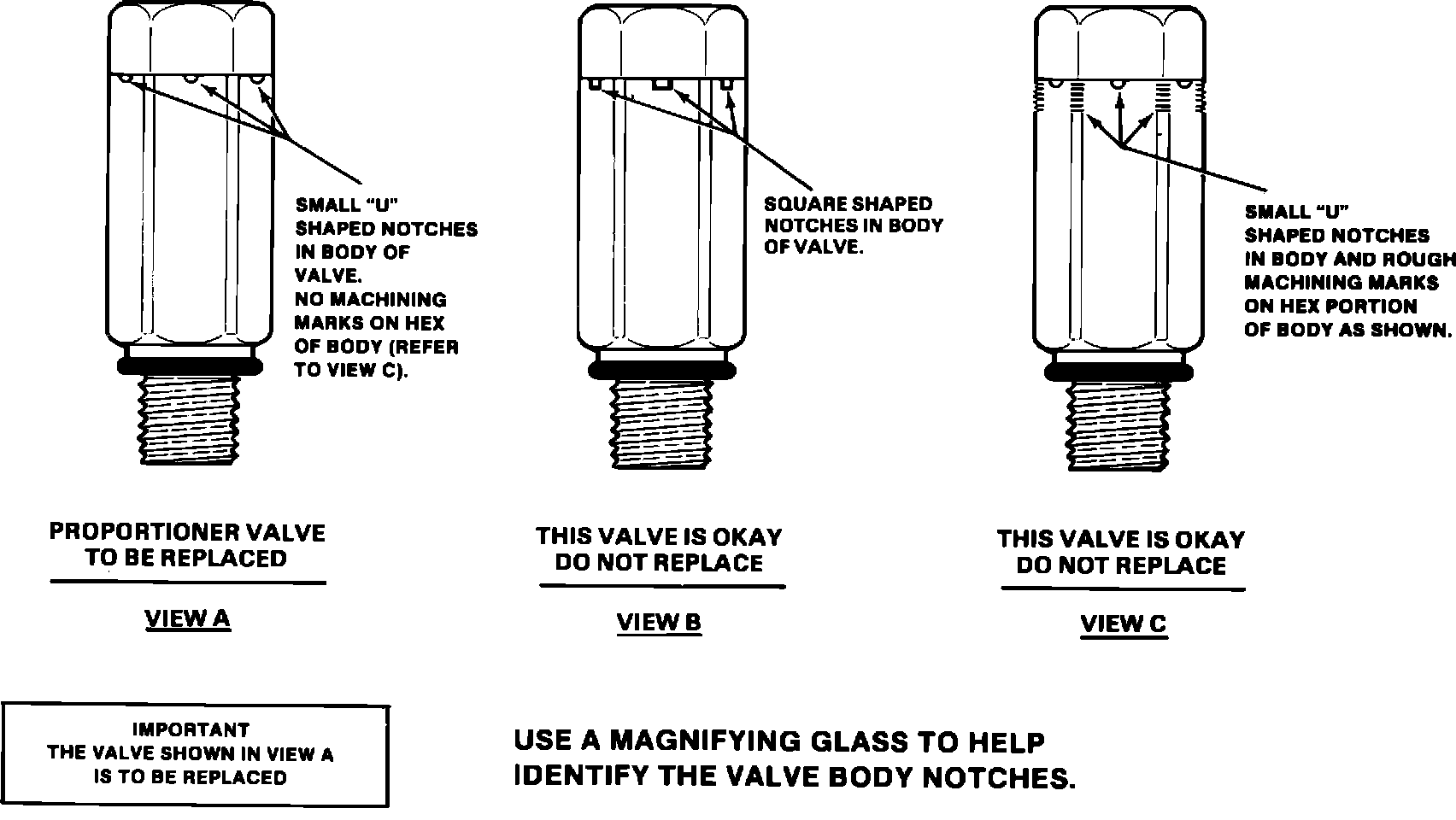 4. Replace all proportioner valves, as instructed in PART II of this procedure, that are of design shown in View A of Figure 1. If the valve identification cannot be accurately determined, or there is a question on identification, valve(s) should be replaced.