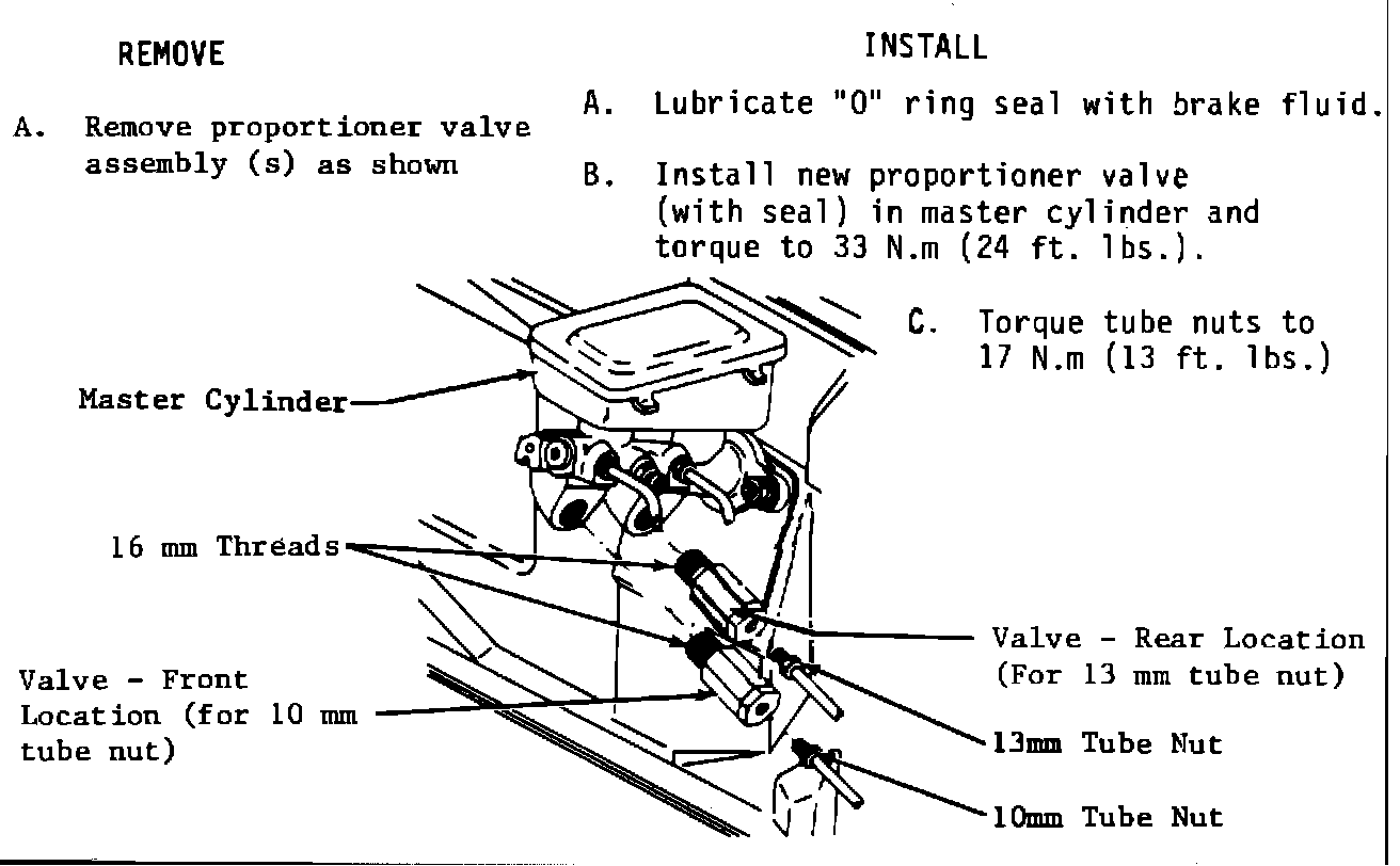 To prevent the possibility of this condition occurring on vehicles involved, dealers are to inspect to determine if a vehicle has suspect proportioner valves as instructed in the Service Procedure of this bulletin. ALL suspect valves are to be replaced.