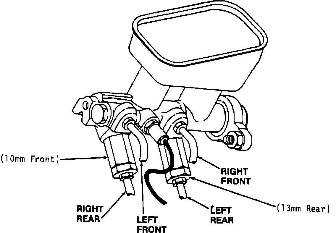 d. Remove left front pipe connector. Refer to Figure 3. When brake fluid begins to flow from left front master cylinder port, reconnect left front brake pipe and tighten to specified torque.