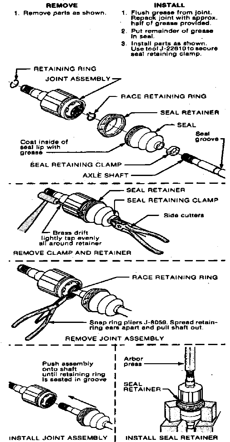 Fig. 15 Inner constant velocity joint seal removal & installation. 1982-84 Citation, Omega, Phoenix & Skylark; 1982-84 Cavalier, Celebrity, Century, Cimarron, Cutlass Ciera, Firenza, 2000, Skyhawk & 6000: