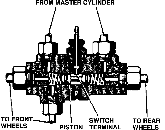 This switch assembly which is used on some diagonally split brake systems and Corvette four wheel disc brake systems, is connected to the outlet ports of the master cylinder and also to the brake warning lamp that warns the driver if either the primary or secondary brake system has failed.