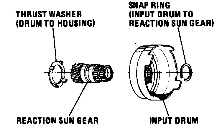 1. Install reaction sun gear into input drum with spline side first, and retain with snap ring.