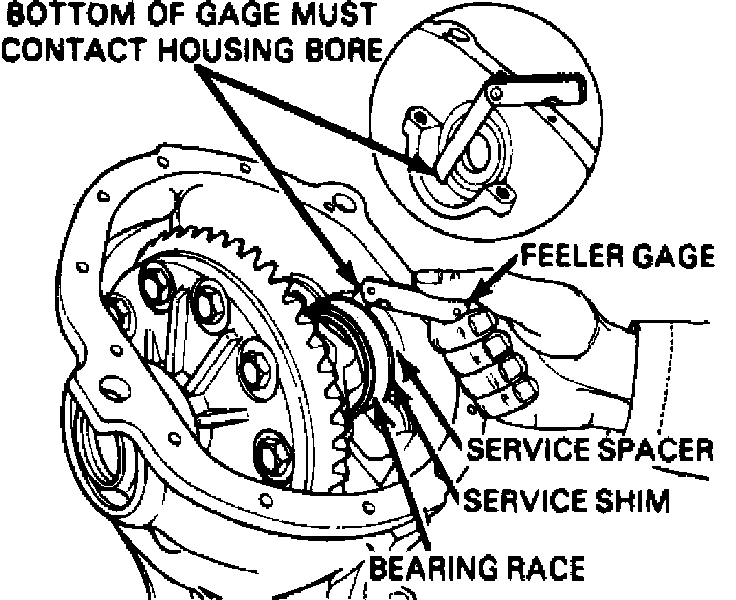 3. Insert progressively larger feeler gauges between shim and service spacer until there is a noticeable increase in drag, Fig. 7. Original light drag is caused by weight of case against housing, while additional drag is caused by side bearing preload. By starting with smaller gauges, a sense of ``feel'' is obtained so that the beginning of preload can be recognized to obtain zero preload. Total shim thickness needed to obtain zero preload is equal to the thickness of feeler gauge used just before noticeable drag is felt plus the thickness of shims installed in step 2.