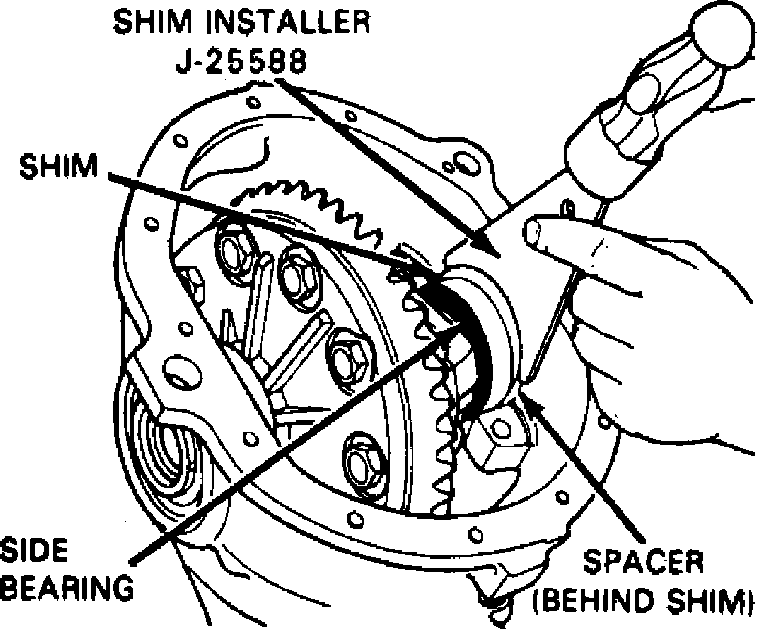 a. Select shim 0.003 inch larger than shim removed from right (ring gear) side, then install shim between right bearing race and spacer.