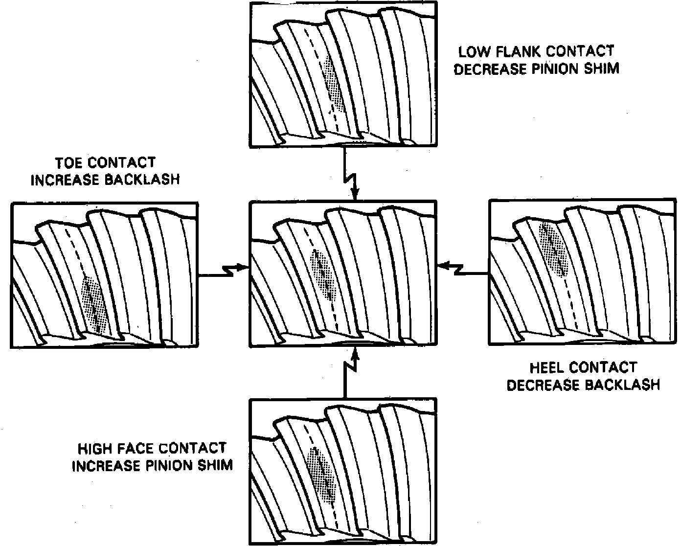 15. Ensure that backlash is still within specifications, then check tooth contact pattern using suitable gear marking compound.