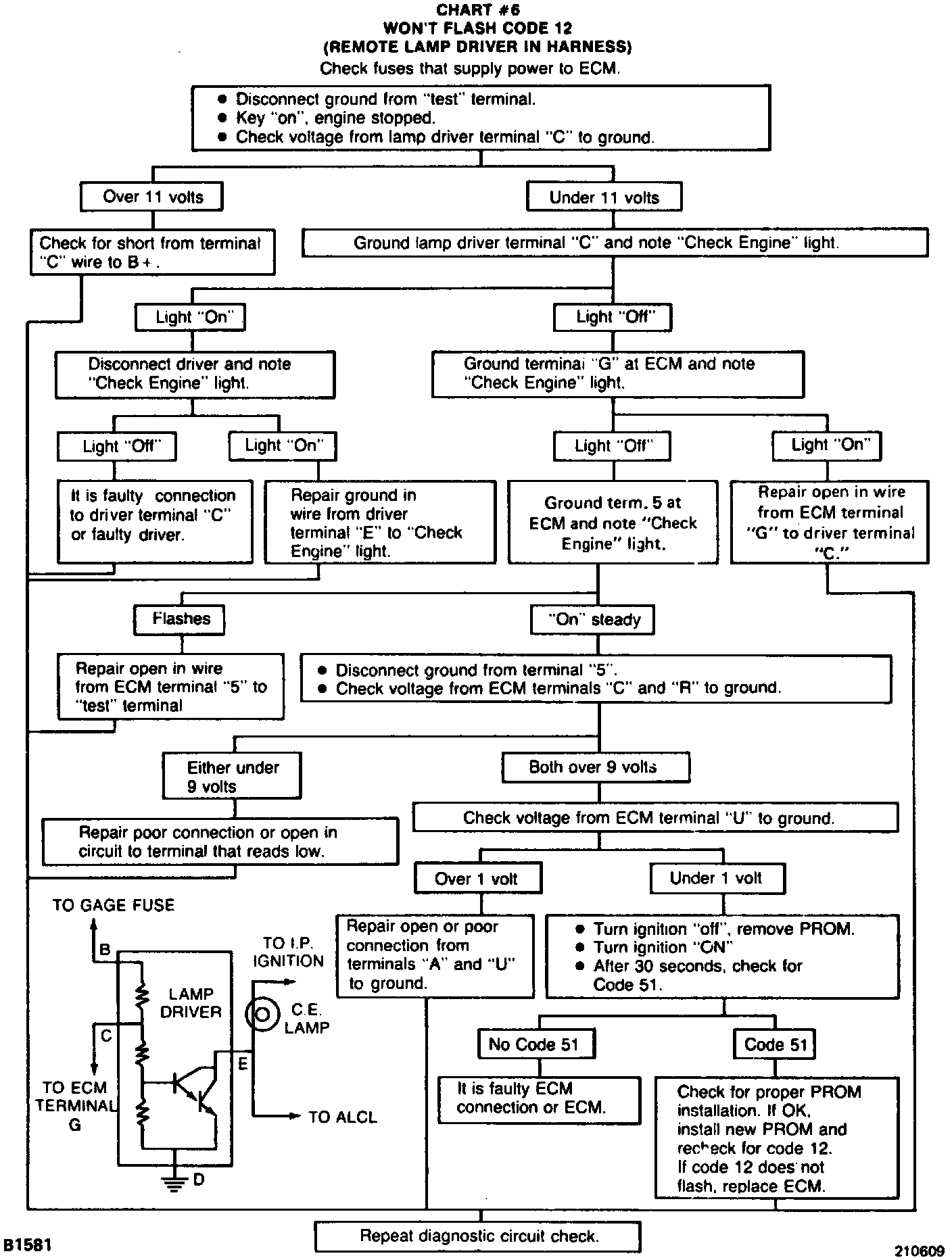 7. This step distinguishes between a faulty ECM and PROM. Normal response is for Code 51 to flash even though the PROM is not installed in the ECM. If it doesn't, it means that the ECM is faulty.