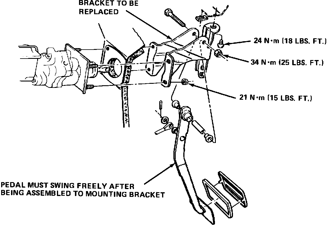 To replace the brake pedal bracket use the following procedure and refer to the instructions in Figure 1 for torque specifications and proper assembly of the components.