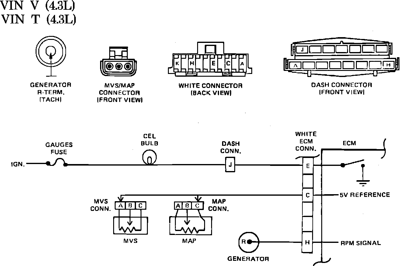 The ECM monitors engine RPM through the tach lead from the "R" terminal of the generator. Engine RPM is one of the inputs to the ECM to calculate the duty cycle of the EGR. With the key "ON", the "CHECK ENGINE" light will remain "ON" until the engine exceeds 400 RPM. If the tach signal is lost, the "CHECK ENGINE" light will remain "ON" after the engine exceeds 400 RPM.