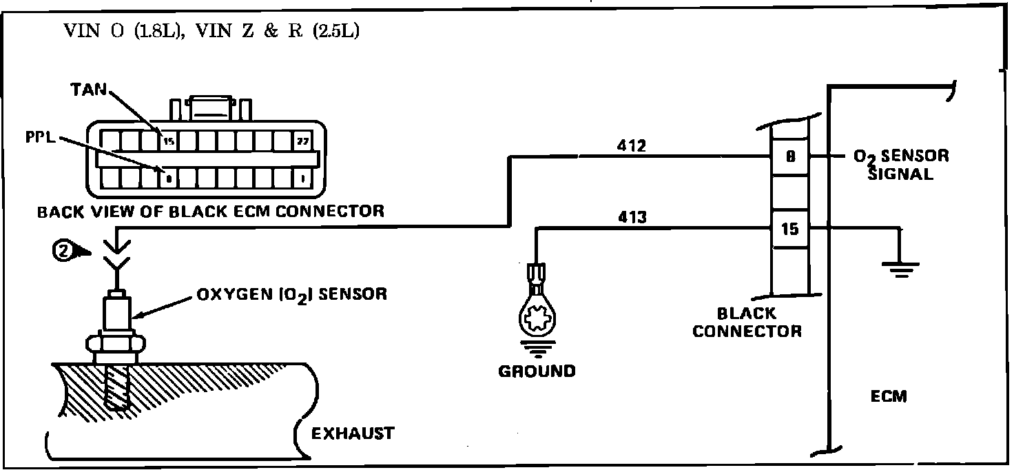 The ECM supplies a voltage of about .45 volt between terminals "8" and "15". (If measured with a 10 megohm digital voltmeter, this may read as low as .32 volts.) The O2 sensor varies the voltage within a range of about 1 volt if the exhaust is rich, down through about .10 volt if exhaust is lean.