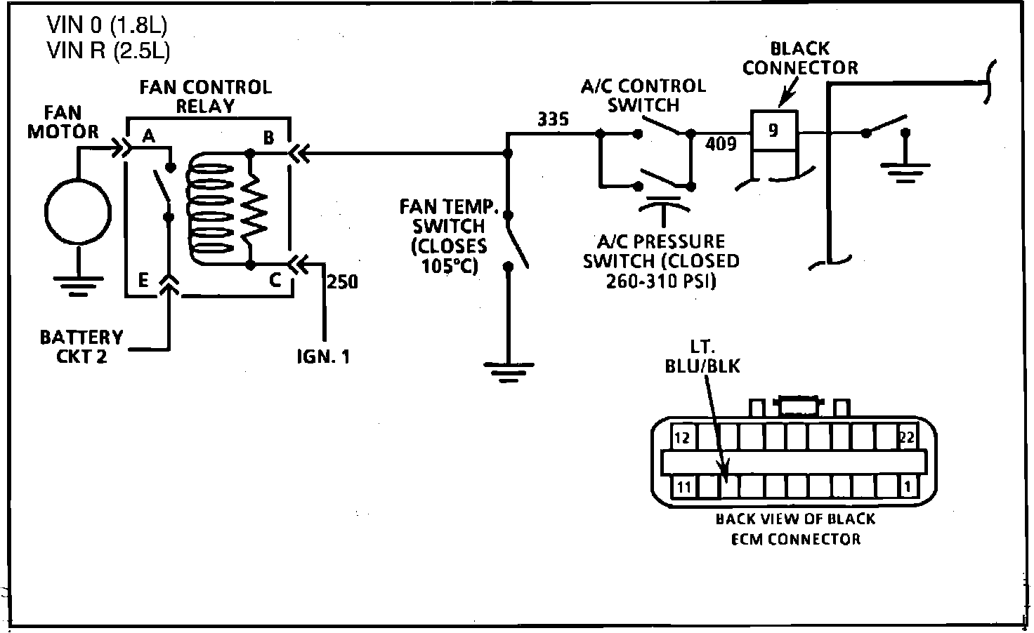 - CKT 335, 409 and relay terminal "B" grounded by ECM C-D connector terminal C1