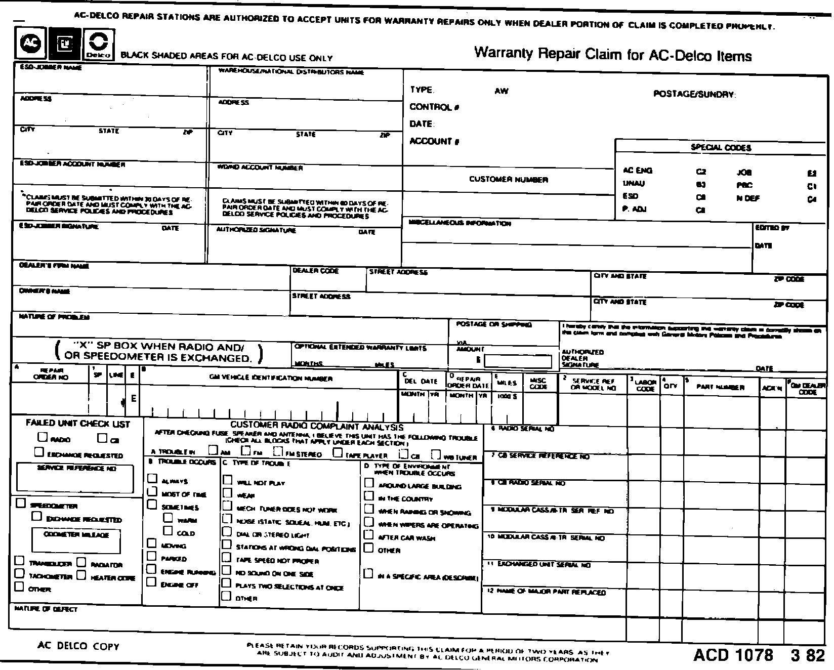 Remove the unit to be repaired from the car, complete all red shaded areas of the Warranty Repair Claim (ACD 1078) (Fig. 1), and send the unit and all (5) five copies of the completed form to the authorized AC-Delco Repair/Exchange center in their area.