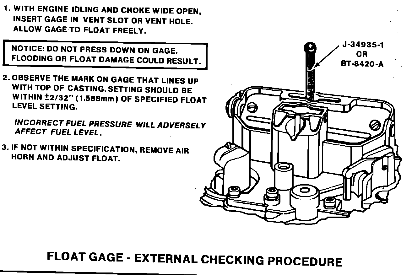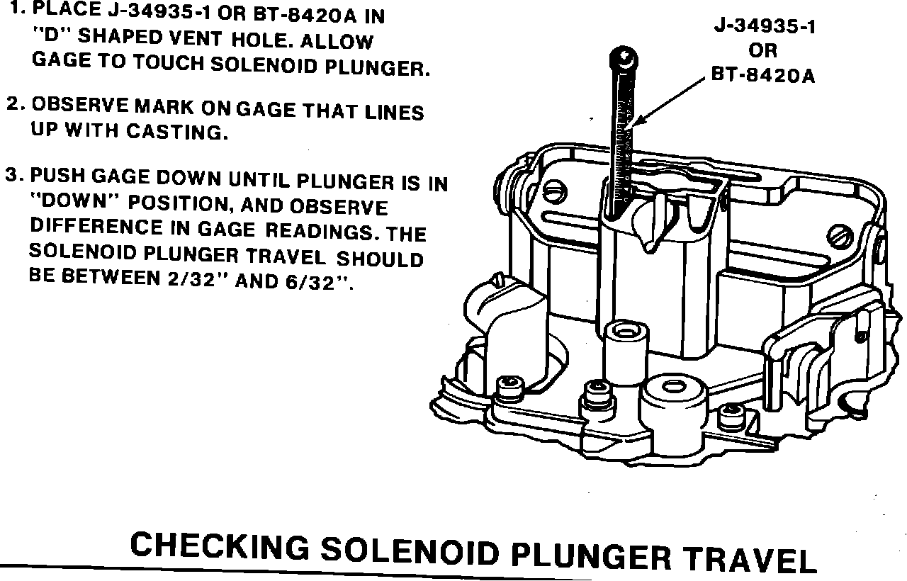 The new gauge, part no. J-34935-1 or BT-8420A, reflects the design variables of the past several years that have led to occasional inconsistent readings when the older gauge was used. The new gauge is also suitable for checking the float level of all past model Dualjet and Quadrajet models, and in checking Mixture Control Solenoid plunger travel.