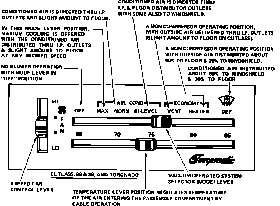 The selector panel permits selection of mode of operation (OFF, MAX, NORM, BI-LEVEL, VENT, HEATER, DEFROST) by positioning a master (select) electrical switch and a vacuum select valve. The vacuum select valve controls flow of hot water to the heater core and applies vacuum to or vents the vacuum diaphragms which control the movement of the air valves in the heater case and the air inlet assembly. The select (electrical) switch position controls the compressor and also provides power to the fan switch.